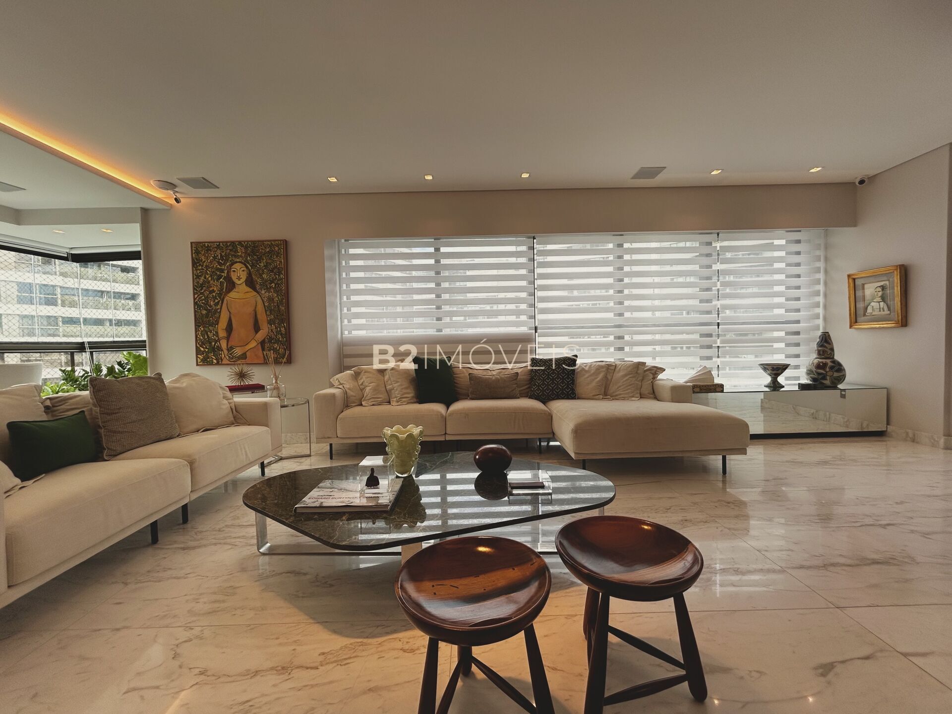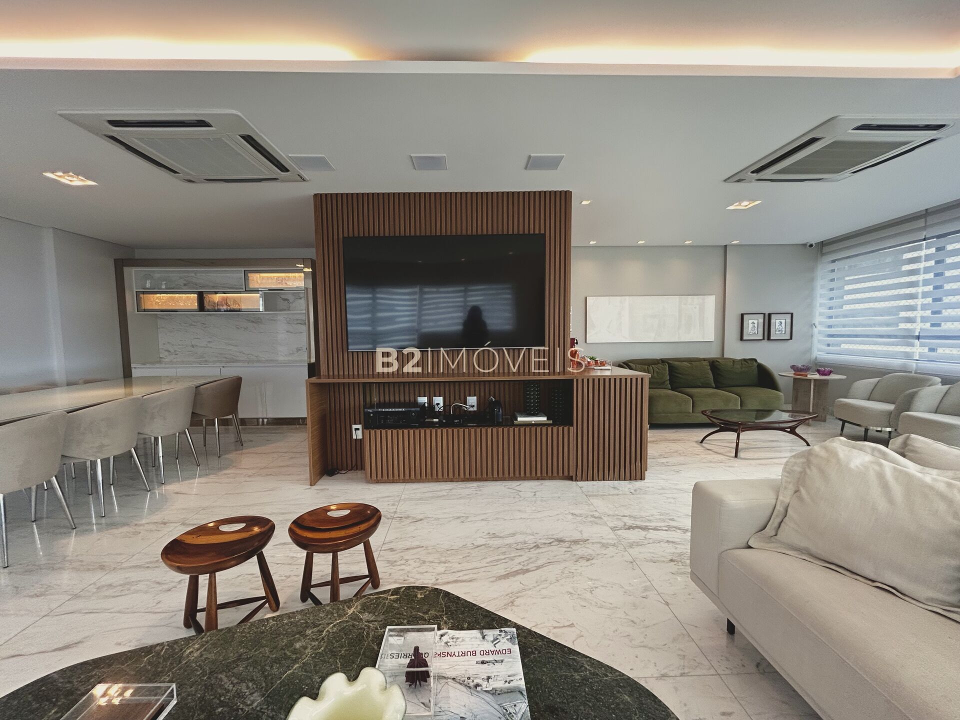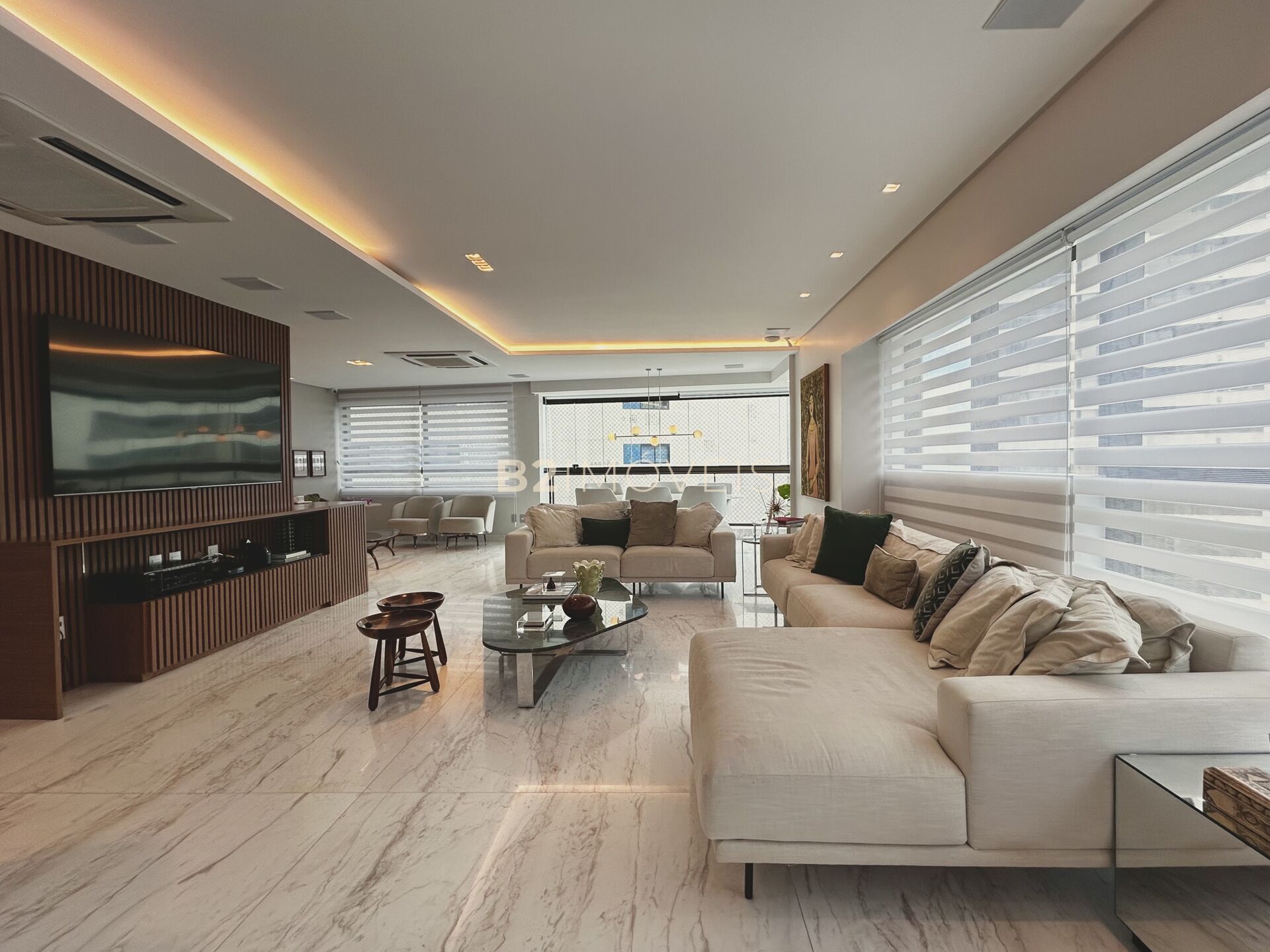 A planta é fluida e bem distribuída, com sala para 4 ambientes, permitindo diferentes formas de viver e receber. A integração com os acabamentos e a marcenaria cria uma atmosfera sofisticada, mas funcional.
